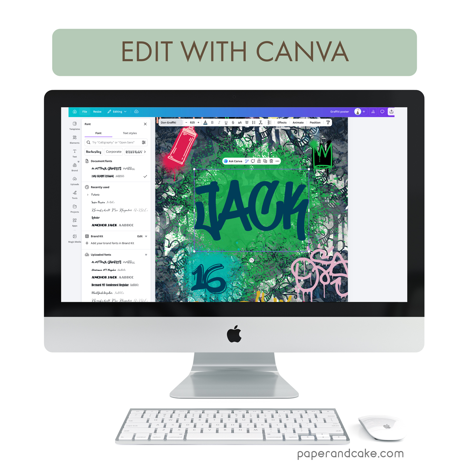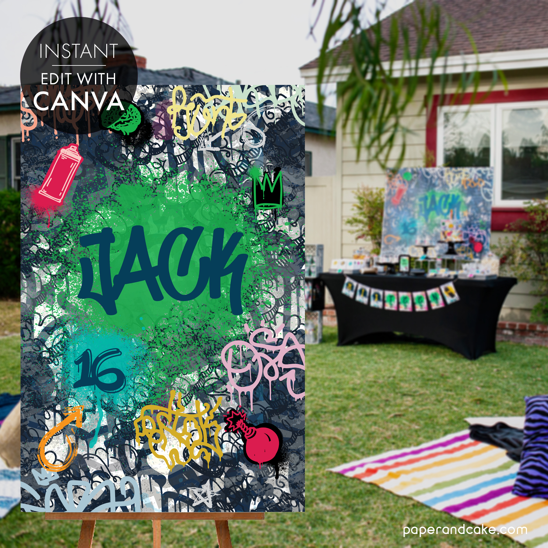 Create custom signage for your next event with our editable Graffiti Template. Edit text and assets using the free version of Canva.